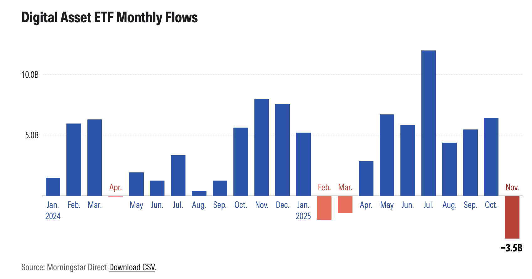 Despite strong institutional and regulatory headlines, November delivered one of the sharpest drawdowns of the year. Bitcoin experienced a c.20% price decline. This move was reinforced by heavy pressure in the ETF market, where U.S. spot Bitcoin and Ethereum ETFs saw more than US$3.4 billion in net outflows, the largest monthly exodus since February. Analysts broadly attributed the correction to macro uncertainty, profit-taking near cycle highs, and liquidity normalization.